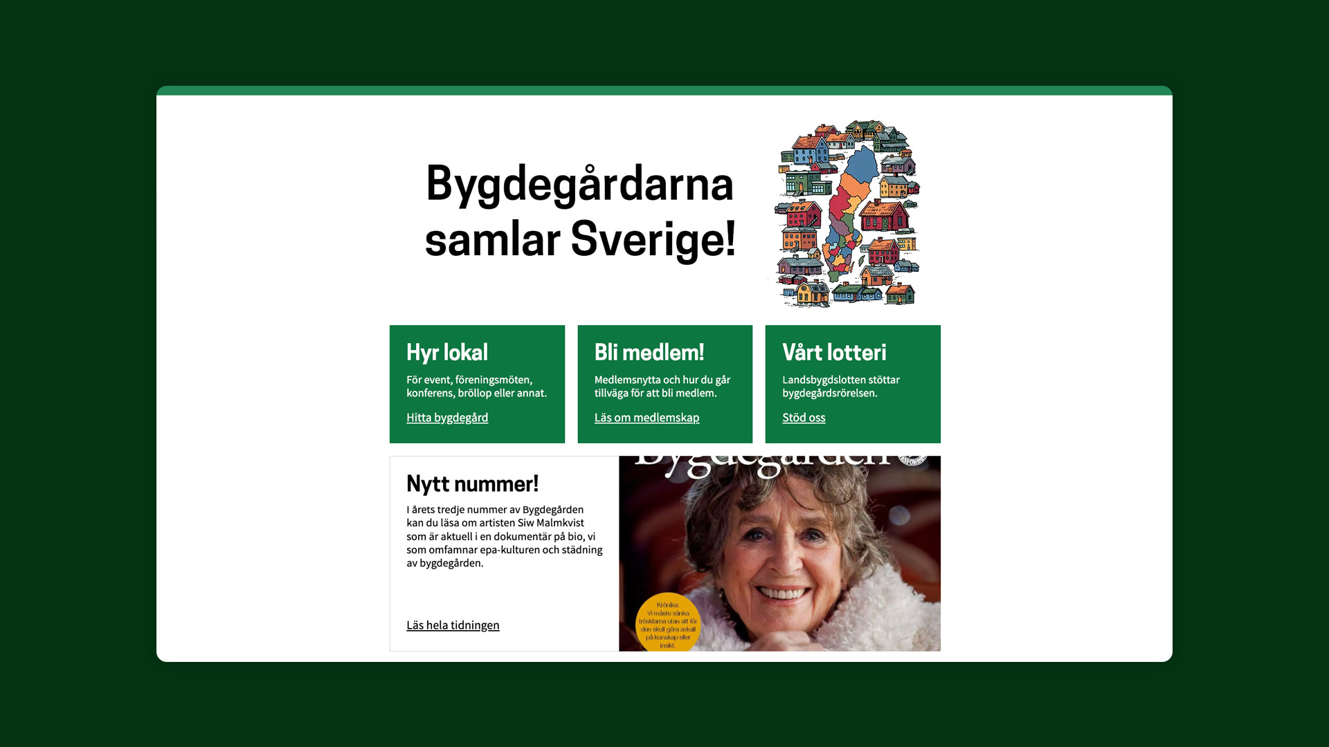 Osolo fick förfrågan från Bygdegårdarnas Riksförbund om att ta fram en helt ny modern och användarvänlig webbplats baserad på WordPress. Man önskade också en uppdaterad och moderniserad grafisk profil.